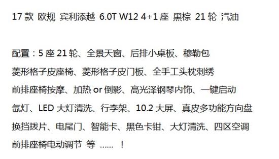 世间奇境万千,宾利添越 (配置|询价)SUV是一款能将引领您深入奇境背后的非凡意境的豪车。这是我们近日从天津狮王国际贸易有限公司了解到的,刚刚入港的SUV——17款 欧规 宾利添越。狮王汽车公司拥有库房千米,每月定期大批车辆到港,改装场地近万平,统统可供君任意发挥你的想象力来对您中意的爱车来进行DIY!在这金秋时节的到来,各配置车型全面清理,近日提车更有豪礼相送,配置,颜色,手续齐全,国外发车,一手车源,把更多利润优先让给您!欲购从速,机不可失,期待与每一位新老客户的合作。质量是我们的保证,您的满意是公司永恒的追求,更多车型配置请致联负责人,本文配图均为天津狮王国际贸易有限公司提供!