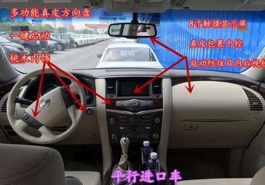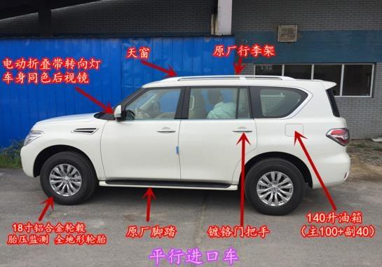 [天津最新行情] 编辑从店内了解到,2018款日产途乐中东版奢华改装给力出售,配置:7速手自一体,前后双叉臂悬挂系统,前后通风碟式.机械控制停车,18 寸合金轮毂,2 气囊 ,(ABS)防抱死系统,(BA)制动力辅助,(EBD)电子制动力分配系统,(HSA)坡道起步辅助系统(HDC)下坡控制辅助,限速差速锁,电眼,双倒车影像(尾翼带摄像),高位刹车灯,摇启,桃木内饰,后差速锁,电动天窗,儿童安全门锁系统,防盗,可调光的室内视镜,液压助力真皮方向盘.可倾斜伸缩.带音频控制.免提,ASCD 巡航定速,脚刹,真皮档把,电动车窗,带一键车窗升降,无钥匙进入,一键启动,速度感应式中央门锁,巡航定速系统,(丝绒座椅)驾驶员和前排座椅电动调节,冰箱,紧急报警装置,电动尾门,前排自动空调,后排冷却,6个扬声器,前排 8 寸 LCD 屏.QVGA 屏,车身同色后视镜.侧边带指示灯,镀铬车门内把手,4 个卤素大灯.大灯清洗.增强的自动光,LED 后灯,前后雾灯,自动危险警示信号和大灯,日间行车灯,胎压监测,车门碰撞感应解释功能,前脚踏灯,后扰流板,散热器格栅,拖钩,单独的排气尾管,备胎,拖钩,后排娱乐预留,SE 标识。(注:18 款 SE 版多双倒影,尾翼带摄像,后娱预留,无 BOSE
