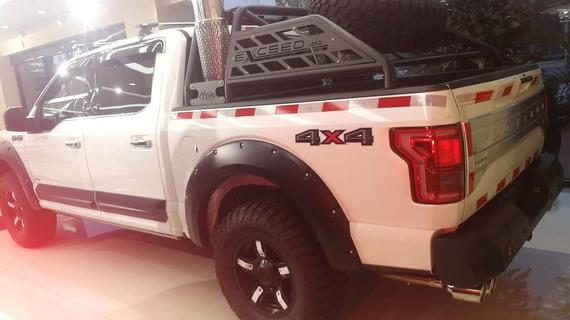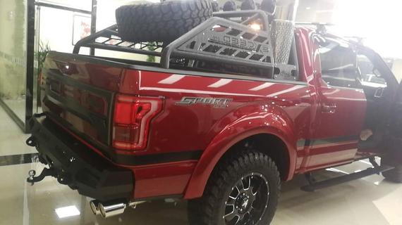 细节方面:17款福特F150加版如其名,高大威猛,进口福特F-150 (配置|询价)皮卡车兼实用与动力于一体,不光可以承载您的搬运用途,拖拽、飚速都一样能够满足你。 福特猛禽方方正正的前大灯与前保险杠造就了完美的车头造型与比例。尾部的设计乏善可陈,并无太强视觉冲击力。RAPTOR的字标还是很有感觉的。