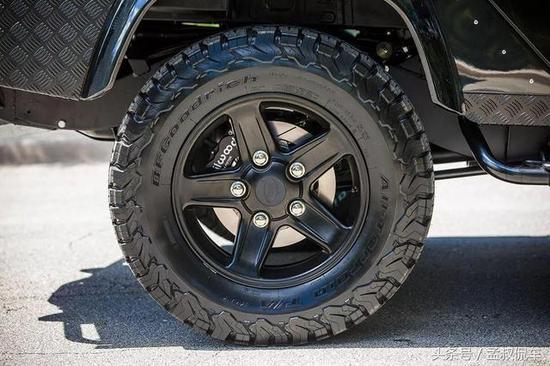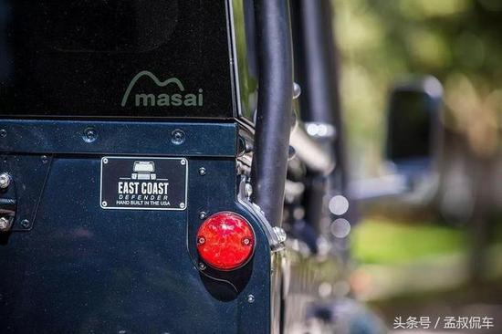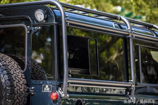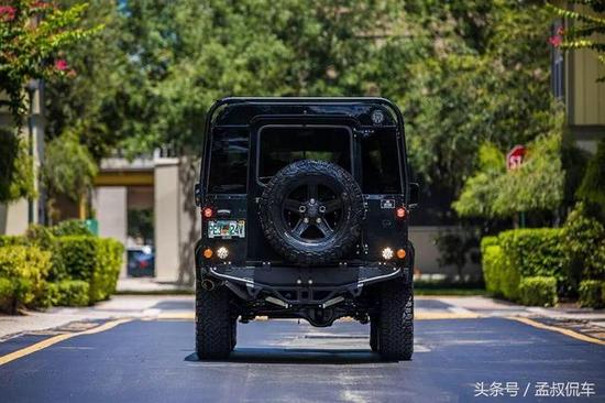 尾部非常简洁利落,车身前后加装有有前/后杠和Warn VR8绞车,并配有后挂式备胎。车身外表有很多裸露的螺丝,看上去很有金属质感,散发阳刚魅力。尾灯与头灯一样,采用分体式设计,尾灯、刹车灯、雾灯都分散设计,复古气息非常浓厚。