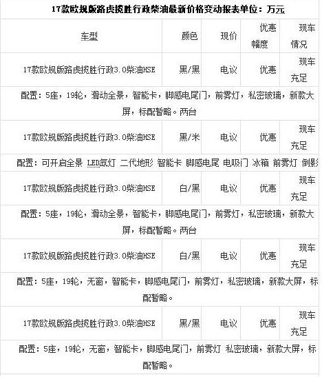 [天津最新行情] 编辑从天津嘉鸿浩润汽车销售有限公司处获悉,目前2017款路虎揽胜 (配置|询价)行政美规版现车在售,颜色主要以(黑色/白色/等等)为主。购车可优惠万元。对这款车感兴趣的朋友们不妨进一步关注一下。具体价格请详见下表: