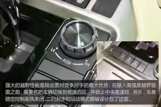 17款丰田酷路泽4000新增加了“蠕行模式”,在这种模式下,驾驶员只需专注的控制方向盘,不需要踩油门和刹车。以免路面的颠簸对车身的震荡引起对油门控制幅度大小的变化。17款丰田酷路泽4000在档把右下方,有个较大的旋钮,驾驶员可通过旋钮,切换三个不同速度的行驶模式。