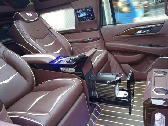 这最新的凯迪拉克总统一号豪华越野车,可谓是一款非常巨大,内室也非常的豪华大方,米色真皮桃木内饰相得益彰,后舱两个主座为带腿部支撑和加热功能的电动按摩座椅。后排的硕大的sony显示屏,可以直接联网,还可以类似于KTV唱歌,最顶级的BOSS音响,给予了这款顶级美系豪车超豪华的娱乐体验。