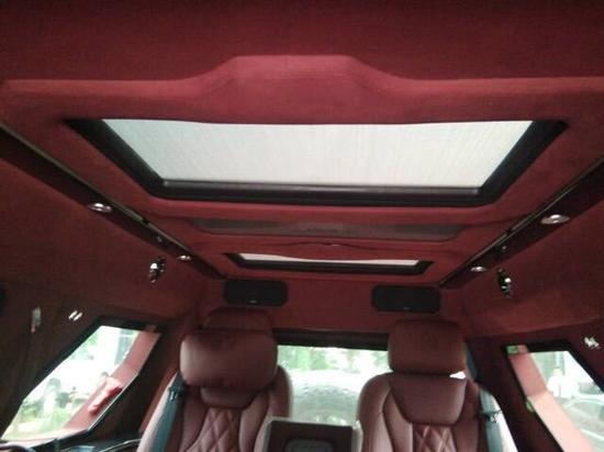 乔治巴顿内饰经过高档双色真皮重新包裹,搭配木纹饰板点缀,使得原本就宽敞霸气的内饰更显豪华。乔治巴顿打开后门进入后厢,这才是这辆车最重要的部分,低透光度的暗色玻璃在车外几乎看不到车内,你不配置也可谓是极尽奢华,第二排独立的两个座椅舒适宽敞,完备的影音系统提供了非凡的视听感受。