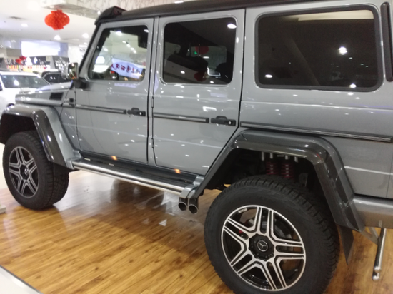其他方面:奔驰G5004x4不过外观并不低调,前保险杠被分成了三个方形的进气口。轮圈则装上了和AMG款式相近的大五星款式,并采用黑色设计,加上整个黑色的车身,流露出霸气的气质,这套轮圈尺寸达到了22英寸,采用轻质合金打造,配上295/35 R 22的轮胎。