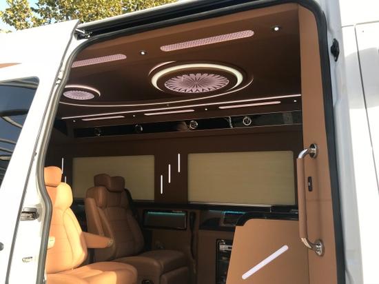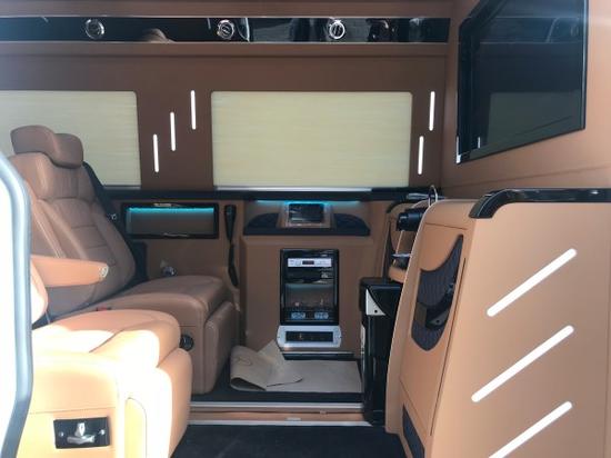奔驰斯宾特前后舱全隔屏式设计,车窗电动百叶窗帘顾全隐私,大屏LED电视自带电动升降,索尼蓝光DVD联手BOSE影院级环绕音响,还原最真实、感受最震撼的影视、音乐现场氛围。欧式豪华一体式吧台,仿大理石纹路,年代厚重感油然而生,沉淀着商界精英的人文体现。 车顶设计层次感分明,氛围灯光透过晶格状饰板洒下,烂漫星光,豪华性立现。尾部星空天窗,仿佛置身浩瀚宇宙,忘尽凡俗。