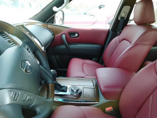 内饰方面:18款途乐Y62中东4.0 为三排座车型,内饰整体风格豪华,真皮座椅、DVD娱乐、上下坡以及胎压监测等装备也都悉数出现。新款日产途乐内饰材质也更加的考究,使用了皮革,铝以及木纹样条作为点缀。采用了豪华轿车惯用的四幅风向盘设计,粗细比较合手再加上真皮加实木的用料,手握感觉极佳。另外方向盘功能强大,集成了音响、空调控制及蓝牙车载免提系统,使驾驶者在行车中更为安全,做到手不离方向盘。同时方向盘加热功能,令驾驶者双手在寒冷的冬季也能得到最佳的呵护。