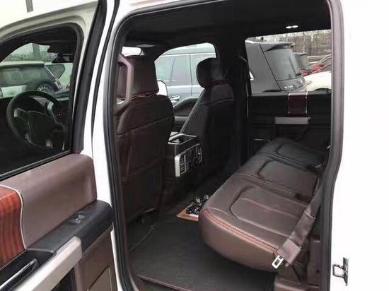 空间方面:福特F150国王牧场版宽敞的空间可以让成员舒服的伸开双腿、展开双臂。后门宽度明显比前门窄的多 但内部空间却依然满足需求。后门前端安装着安全带,可以保证车内乘员的安全。充沛的动力和身高马大的车身的确能够给驾驶者带来难以名状的满足感,除了载重卡车,路上所有的车辆都敬而远之。