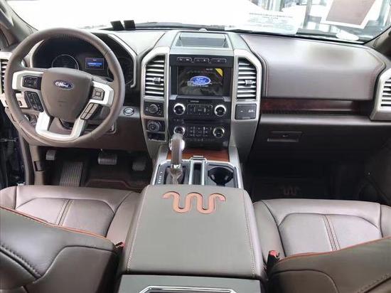 内饰方面:17款福特F150加版3.5T国王牧场版内饰采用独特的中控台和门饰板面漆和真皮包裹的方向盘。在内部空间的庞大基础上,福特也提供了非常具有舒适性与服务性的内饰配置。 17款福特F150加版3.5T国王牧场版配备的是双叉式独立前悬架和钢板弹簧非独立后悬架的配置,并带有FOX的赛车减震器,可以轻松应对各种off-road路况。