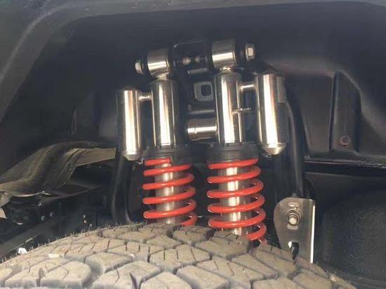 17款奔驰G500以越野能力称王已久:梯形大梁结构粗壮结实,全时四轮驱动系统通过整体桥式非独立悬架和它紧密连接,事实证明G500这种结构的老底盘对于越野车来说是最坚固可靠的。新车全时四轮驱动系统取代了以前的手动分动器,在40km/h车速下的行车过程中,通过变速箱档把后的high/low按键,就可方便地将4h切换至4l模式,此时分动器传动比能从原来的0.87∶1变成2.16∶1,加大的扭矩足以对付陡坡高坎。
