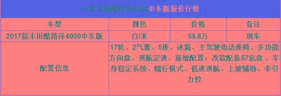 [天津最新行情] 天津宝利隆平行进口汽车贸易有限公司最新优惠行情,此车属于存进口中东版越野车18款酷路泽4000在细节修饰上颇具造诣,硕大的身材,新款采用4.0V6发动机 改款后配备6速变速箱,增加极具漂亮独特的流水大灯,还有车的钥匙也改进远比最基本的升级了美观了好多。现车在的车价格,同比优惠3万,这么一款好车您值得拥有。配之侧身线条来看的话,视觉上的冲击较之前酷路泽更加突出。采用全新的镀铬中网,前脸的造型更为硬朗、利落。采用了更多先进的技术,更重要的是提升了动力输出的平顺性。店内丰田酷路泽4000火热销售,店内现车特价,最底价呈现惊喜不间断,颜色齐全,手续正规。