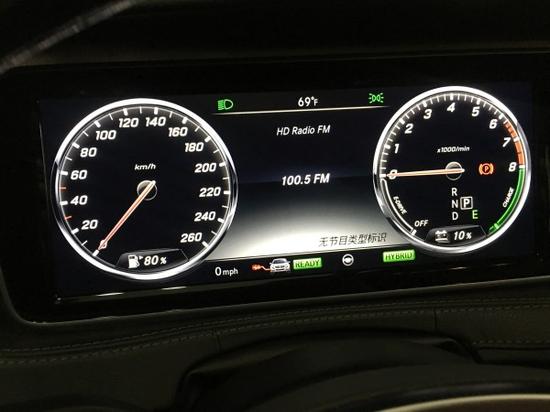 17款奔驰S550e的仪表盘是全液晶的,并且带有外围氛围灯,科技感十足,而且奔驰的液晶仪表盘是经过的特殊的设计,长时间的看仪表盘也不会对人眼造成视觉疲劳,仪表盘里显示了所有的信息。木质真皮方向盘下方带有梅赛德斯-奔驰的英文签名,虽是细节,但是起到了画龙点睛的作用,豪华感再次提升。