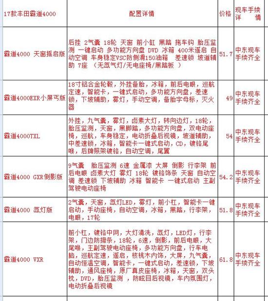 丰田普拉多 (配置|询价)4000中东TXL现车到店,强悍越野开释活气,丰田普拉多4000中东TXLT大气雅观的形状和经典的配色着实让消耗者馋涎欲滴,时尚的功效性配置及其精 确的建造工艺为劲车计划设定了新的尺度。多项科技平安配置,让驾驶者在享受极致驾乘兴趣的同时 ,还保障了车辆的平安使用。购车当天供给(发票、合格证、一次性证书、保养手册、三包凭证、首保卡等可在国内任何一家4S铺保养售后办事,购车终了后只需你回本地管理购买税上牌即可,确保国内落户上牌) 出售外地车辆出一时牌照。让泛博主顾没有后顾之忧!更多详情请咨询经销商,电话在新闻底部