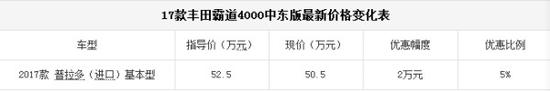 17款丰田霸道4000中东版新车配备定速巡航、底盘升降、上下坡辅助底盘以及和谐调校的底盘,实现了公路行驶和越野性能的最佳结合。搭载的是4.0升V6 VVT-i发动机,与之相匹配的是VX-R 5速自动变速器,从容应对着170多个国家的地域环境,深受追捧。新车具备了上佳的公路驾驶性能和高档车的舒适性能。