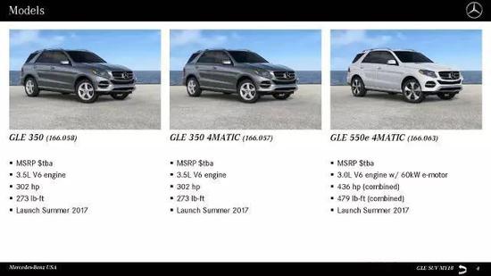2018款奔驰GLE将有6种型号,GLE350、GLE350 4MATIC、GLE550e 4MATIC、GLE43、GLE63和GLE63S。GLE43将是2018款平行进口版的主打车型了,362匹马力的大功率3.0T发动机,AMG独有工艺内饰,而售价也要比400高出近10万左右。GLE550e是插电式混合动力,由于和国内充电设备不通用,很多用户可能会顾虑到充电的问题,所以GLE550e在国内不会有大作为。