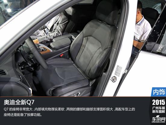奥迪Q7的内饰延续了奥迪一贯的严谨细致,这应该是奥迪内饰的一个发展方向,在材质和做工上豪华精细。新奥迪Q7真皮包裹的四辐式方向盘造型饱满,角度以及深度可电动4向可调节,方向盘左侧的控制杆主要控制远近光以及转向灯,其它灯光控制通过驾驶员左侧的旋钮控制。考虑到SUV车型应有的空间表现,第二排座椅除了标准的4/6椅背分离之外,座椅还可进行前后滑移与椅背倾斜调整,加上简易的快速倾倒功能,仅需拨起座椅旁的释放杆,座椅即可向前折迭,并与第三排座椅、尾厢形成平坦底板。