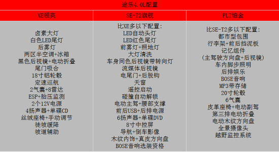 2017款日产途乐XE/SE港口最新报价行情2017款日产途乐XE 4.0L V6 配置:自动挡,带转换,140L油箱,七座,七速,两气囊,18轮,全尺寸备胎,前保险杠,黑色门镜,镀铬内门把手,脚踏,电动折叠后视镜,卤素大灯,LED尾灯,后雾灯,带车速传感器的间歇性雨刷,标准散热格栅,尾翼,手动方向盘调节,多功能方向盘,真皮档杆,电动车窗,一键式启动,定速巡航,模拟驾驶计算机系统,手动布艺座椅,冰箱,车内灯,智能卡,尾门自动关闭,前自动空调,4扬声器,防盗系统,ABS,EBD,上下坡辅助,后差速锁,胎压监测,镀铬包,