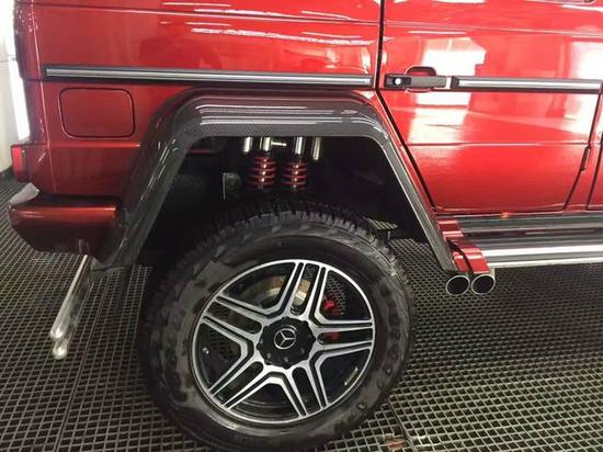 奔驰G500 4x4与平凡版G500比拟采取越野地形底盘 四轮**悬挂,具有最高通过性的纯种地形越野车,奔驰G500 4x4四轮**悬挂越野车的四轮轮眉宽度有了明显的增加,黑色的碳纤维轮眉付与了整车加倍强悍的经过历程技能花样和越野技巧的野性。