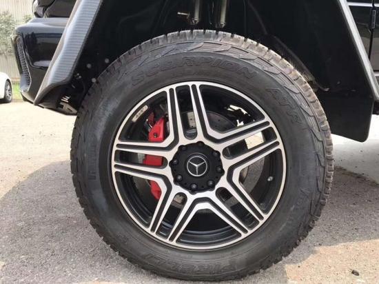 奔驰G500 17款 4x4² 配置:离地距离 450mm、涉水能力 1米、轮胎间距 1.744mm 单天窗、22轮、红卡钳、双减震、氙灯LED日行灯、多轮廓电动包裹座椅、翻毛皮内饰(翻毛皮双色座椅、翻毛皮方向盘、翻毛皮门板、翻毛皮内顶)、前排座椅通风加热、二排座椅加热、哈曼音响(14个扬声器)、三把差速锁、中控碳纤维装饰、底盘舒适度调节、脚踏、前电眼、倒影、导航、多功能方向盘(蓝牙、定速巡航、换挡拨片)、双区空调