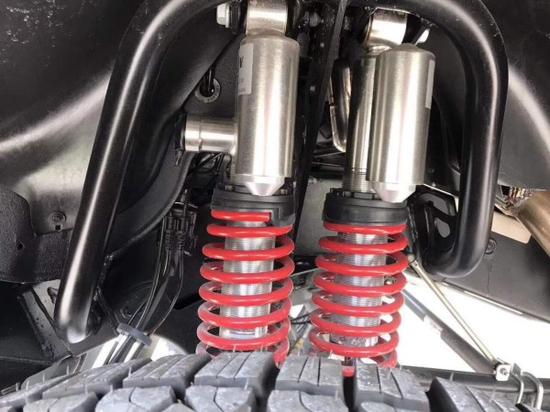 这辆车虽然只有四个车轮,但却用了8个避震和8根弹簧,这一设定不仅与普通版G级车型不同,而且与6x6车型也不相同。奔驰表示,这两根避震中有一根的阻尼是固定的,而另外一根的阻尼是可调的,从而实现运动和舒适模式的切换,而切换时间只需要15毫秒——够快。