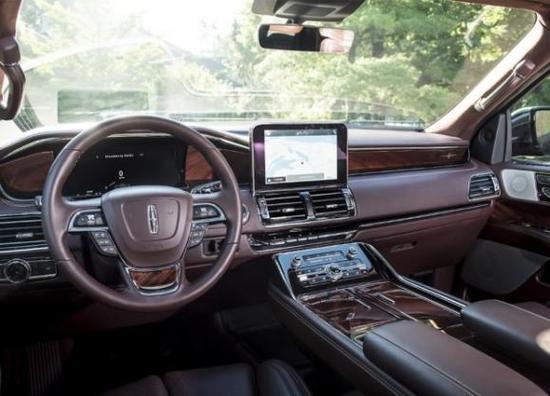 林肯领航员的内饰还是传统美式的风格,采用大面积的皮质和实木材料,悬浮式的10英寸中控大屏也增添了一些科技感。车内能触碰到的地方都用的是软性皮质材料,可以说是将豪华感武装到了牙齿,满满的质感。真皮包裹的方向盘直径也是很大,无时不在提醒着驾驶者,这是一辆大型SUV。仪表盘部分也采用了时下流行的全液晶屏设计,科技感十足。