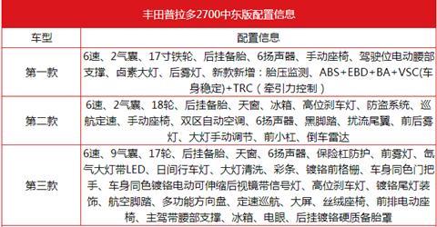 其他方面:17款丰田霸道2700先进的发动机提供强劲输出功率及扭矩,使操控性、舒适度及行车表现皆傲视同侪。霸气英姿,速度快、反应最灵敏,为它肌肉感十足的外观赢得了更高的回头率。独特设计风格更显时尚与运动气质,而一系列贴心且有针对性的功能,让车主畅享愉悦体验。17款丰田霸道2700搭载的是代号为2TR-FE的2.7L发动机,这台偏重扭力的发动机专门配备SUV车型,其最大功率为120kW(163Ps),峰值扭矩为246Nm。此外,新车还全系标配了四驱系统。低速四驱模式,扭矩放大2.566倍,用于极端的越野路面。