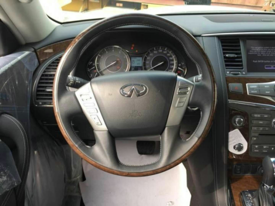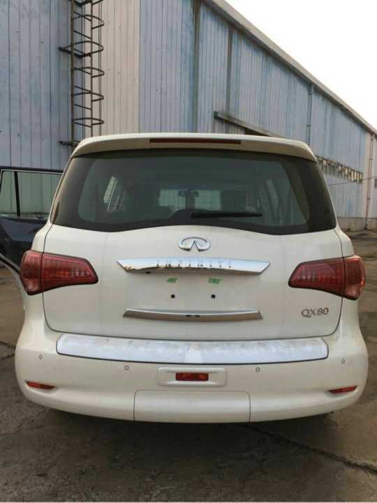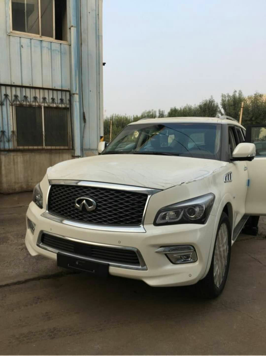 2017款中东版英菲尼迪QX80 (配置|询价)颜色:黑/黑 ;白黑 ;黑/米配置:5.6排量v8 398马力 7速 全时四驱 拖车模式 雪地模式 多功能方向盘 一键启动 无钥匙进入 nappa真皮内饰 nappa真皮座椅 主驾座椅记忆 主副8项电动座椅 腰部支撑 触摸大屏 自动空调 钟表 座椅加热 天窗 自动防炫目后视镜 桃木内饰 电动尾门 冰箱 后排自动空调 后娱 第三排座椅电动收放 隐藏脱钩 前后电眼8个 led大灯 led日行灯 自动大灯 22轮 环影 胎压 8气囊 定速巡航 行李架 方向盘电动调节
