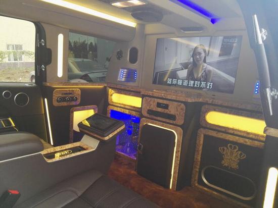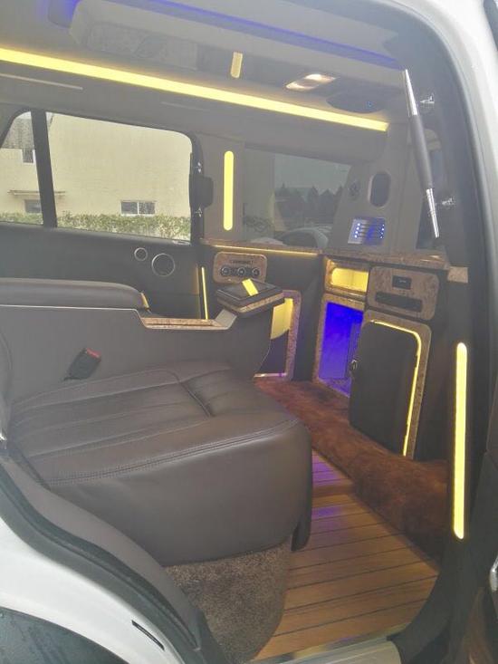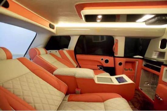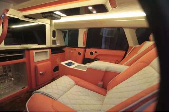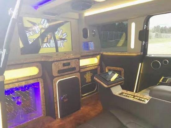 路虎揽胜皇家一号加长版前方座椅加热带按摩功能,车载冰箱一应俱全,由于车比较长,所以配备了前后对讲功能。车内配有一个类似于KTV似的吧台,带蓝光SONY牌DVD,索尼高清LED电视,以色列卫星天线,以及空气净化器,车内带氛围灯。