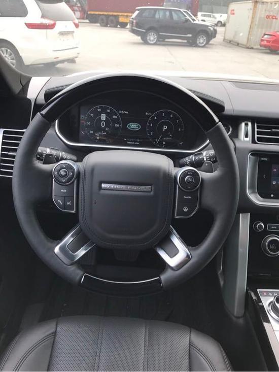 内饰方面:2017款路虎揽胜行政整个内饰无论触感还是视觉效果都堪称一流,充分的向你诠释“豪华”的定义。方向盘采用四幅式设计,双喇叭按钮设计比较靠内侧,当然多功能方向盘上集合了很多功能,不仅带有音响音量调节、定速巡航控制,还配备车载电话的控制。