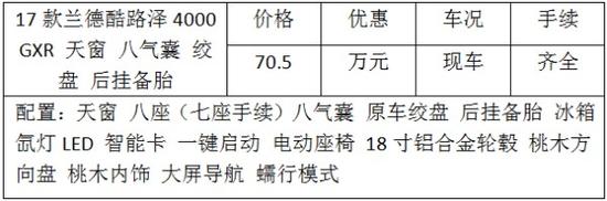 近日,编辑从天津(山卡)国信诚国际贸易有限公司了解到,店内17款丰田兰德酷路泽4000优惠促销,颜色可选,配置多样,现车充足,全国办理分期购车,电话咨询。想了解这款车的朋友不妨进一步关注。