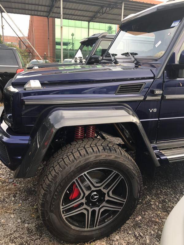 配置: 17款 奔驰 G500 4x42 4.0T (汽油)V8发动机,7速,门式车桥,AMG包围,加高加宽的车身,氙灯,日行灯,黑色翻毛皮内顶,碳纤维内饰,前排座椅加热带通风,翻毛皮和真皮双拼座椅和方向盘,换挡拨片,座椅记忆,碳纤维轮眉,车顶碳纤维扰流板带LED上雾灯,黑色车顶,,不锈钢双车底保护,可调悬挂,22轮,前中后三把差速锁,哈曼音响,红卡钳,打孔刹车盘,小天窗, 倒影,踏板