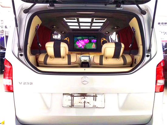 奔驰V260L改装房车的尾箱空间表现依旧称得上的近乎完美,各种尺寸的行李箱都可以随心摆放,对于一些爱好高尔夫 (配置|询价)球、喜欢垂钓的家庭,放置高尔夫球袋、钓鱼杆之类都是不错的,但是这桃木地板毕竟金贵,搁置重物时还是建议能做好相应的防护措施,以防止刮擦。