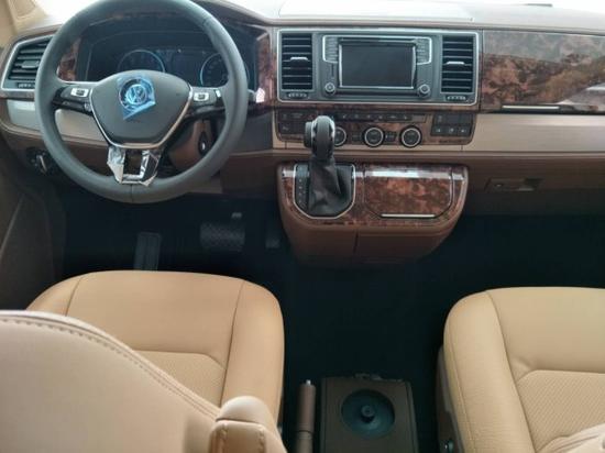关于这款改装版大众T6驾驶舱的装饰,主体上还是保留了大众系列一贯的成熟稳重风格,三幅式方向盘、包括中控台的布局,稳健中透着简约时尚,扶手箱中间的部分配置了一个12L容量的车载冰箱,上置两个恒温杯托以及方便前后舱沟通的联络电话。
