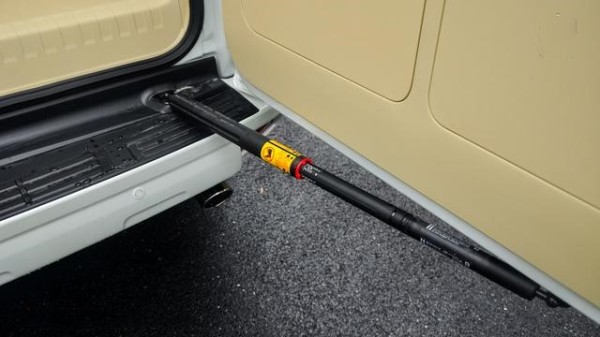 这是一个锁止机构,结构非常简单,手握黄色贴纸那一端,旋转一下,气压杆就会被锁止,此时尾门就无法关闭,用最低成本的方法完美解决了侧风的威胁。别说日本车不厚道哈,把成本花在刀刃上,也是一门技术。