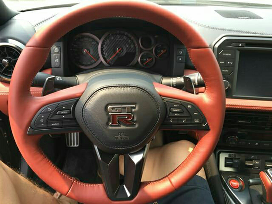 17款GTR内部这次也进行了升级,方向盘右侧的控制面板进行了重新布局,大屏上方增加了光盘插口,屏幕下方增加了出风口,保留了经典的飞机拨片,一键启动更改到档把前方原先在档把后方,这次不得不说的是方向盘样式也升级了,布局更加合理,并增加了镀铬。