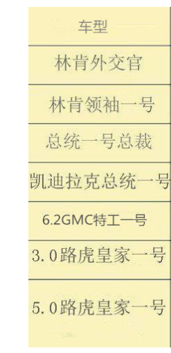 2017款凯迪拉克总统一号配置: 全长:5700mm 全宽:2075mm 全高:2035mm 轴距:3732mm 功率/马力313kw/426hp 扭矩:498N.m 排气量:6.2L V8 整车质量:3311KG 前/后轮距:1710mm/1710mm 轮胎规格:P285/45R22 新款加强型车身 新款加强型底盘 雷达测距 车内空气调节、花粉过滤 主动刹车、主动安全系统 车辆被盗追踪 AFM发动机智能燃油管理系统 全时速TCS防滑平衡牵引力控制系统。 2017款凯迪拉克总统一号这部车不仅外观值得称赞,它的内饰同样不同寻常,一袭黑色格调,优雅而神秘。新款凯迪拉克总统一号竖立的前大灯和透明LED尾灯,大面积方格镀铬隔栅,都体现了凯迪拉克的家族设计。