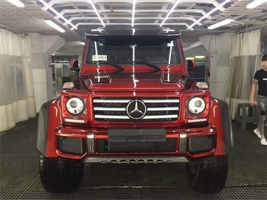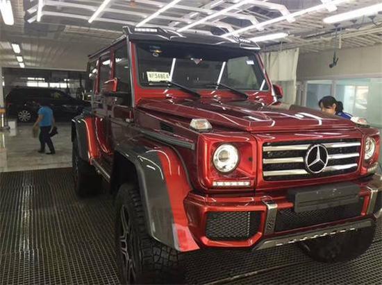 进口2017年奔驰G500 4X4看上去就像是G63 A MG 6x6的四轮越野版。17款奔驰G500 4 x4车顶增添了可拆卸的碳纤维扰流板,并在扰流板双侧融入了LED灯光体系。