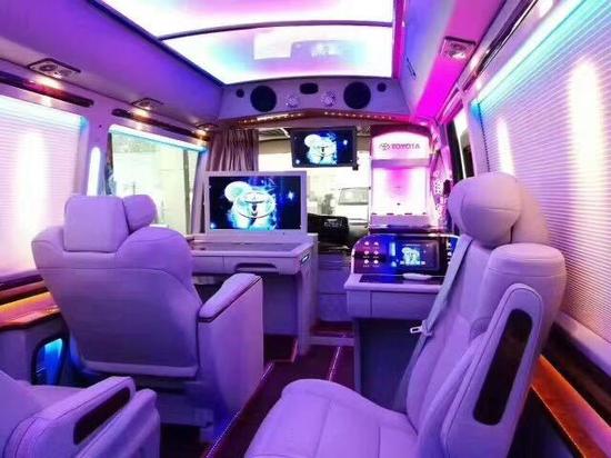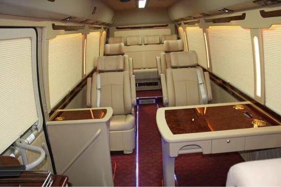 私人定制12座豪华版四张航空座椅一个反方向坐椅(其中两张可电动旋转),保时捷真皮座椅,日本进口冰箱,冰箱柜,雨伞柜,桃木窗框,百褶窗帘,桃木灯光,办公桌,秘书桌,法国进口地毯,19寸LED显示屏,阿尔派DVD主机,阿尔派音响。电动床12座手续齐