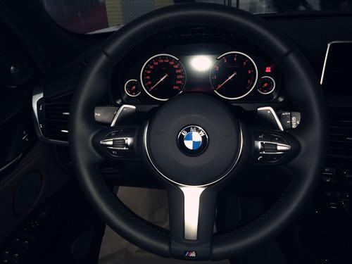 M运动包不仅仅包含外观的运动套件,还有方向盘也是M版运动调教的,三幅式的设计,带有M标识,硕大的换挡拨片就可以看得出来,战斗气息很强,平行进口的宝马X5,只有加拿大版才有这些配置。