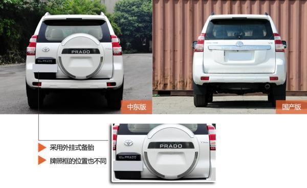 从车尾部看国产版与中东版差别很大,国产版与中规版都是采用下挂式布局,而中东版则采用外挂式备胎,充分彰显了越野车的个性,外挂式备胎也是众多喜爱普拉多的车友所钟爱的。