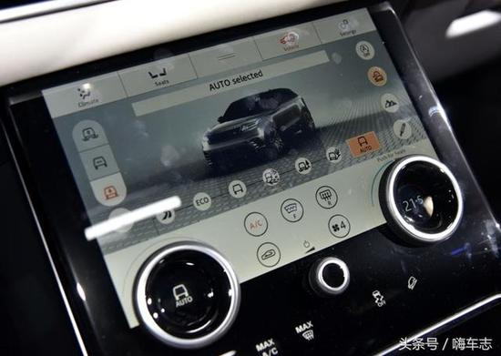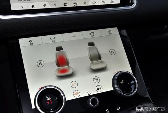 下方这个荧幕了,取代原本很多很复杂的空调按键,以及座椅的设定。上面有四项,你可以任意的去做选择的话,有座椅加热和按摩椅的功能。空调系统是双区恒温空调,然后在旁边有个按钮,按下去就是路虎非常引以为傲的全地形反应系统,在这边可以细分非常多项,如果你觉得很麻烦的话,就用旁边的Auto就可以了。