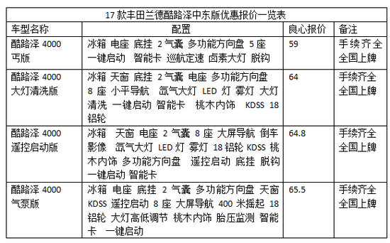 17款丰田酷路泽4000自诞生以来,以其恶劣路况的高通过性、耐用性、可靠性,被誉为顶级四驱之王,深获人们信赖。配备多地形可选驾驶辅助装置、定速巡航系统等,以其优异的性能成绩向世人证明了巡洋舰家族的实力。新车系统将会自动控制发动机和刹车系统,保持稳定的低速行驶,实现出色的车身稳定性。新车透射着浑厚的军人气质,兼顾了不同路况的驾驶舒适性。丰田酷路泽历经60年磨砺演绎着一款不朽传奇,缓冲效果一流的悬架又将来自坑洼或碎石的冲击过滤掉大半。你深踩油门,或提高发动机转速以获得你想要的驾驶感受。