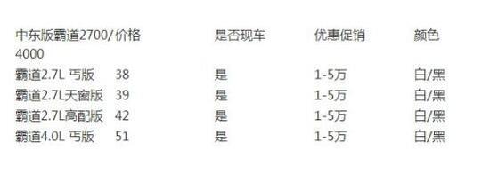其他方面:2017款丰田霸道2700尽展都市SUV的不羁本性,有着无可复制的越野性能。新车采用的全时四驱和中、后两个电子差速锁已经可以解决大多数问题路况。丰田霸道2700满满爆发的战斗力,所向披靡热惠不散场显尊贵身份,超值爆惠限时秒杀,配置丰富手续正规,更多优惠信息请致电商家,为您提供最新最快的行情。