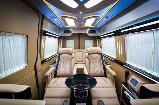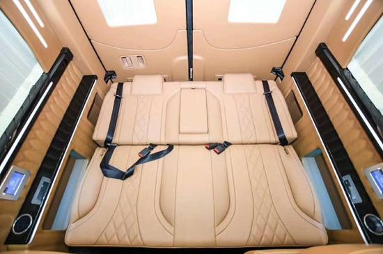 奔驰隐藏九座17款斯宾特:车内侧壁上搭载了一小块方桌,不用时可收起,与侧壁为一体不占空间,后仓的电器控制均集中在座椅,侧面随手可及,灯饰及影音系统开关触屏控制,极为科技与便利。