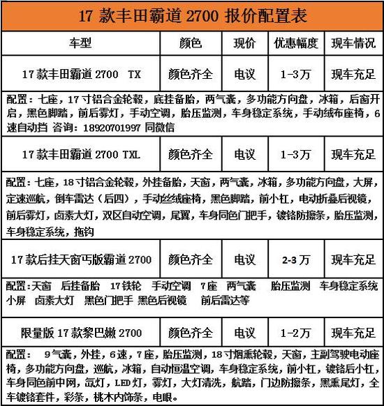 17款丰田霸道2700中东版有大量促销现车在售,色彩充沛可多选。购车可优惠电议。对这款车感爱好的朋友们无妨进一步存眷一下。17款中东版丰田霸道2700开创了豪华SUV之先河,备受媒体和消耗者好评,将助您征服每一段逾越顶峰的路程。更多优惠请联系经销商电话在文章的最下方。
