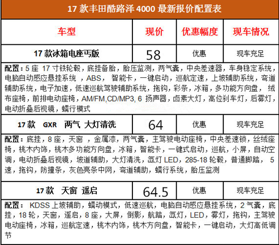 丰田兰德酷路泽4000中东版搭载的4.0V6发动机经过重新标定,它的最高功率也有提升,不过其峰值扭矩对应的转速从3200转升到了4400转。强大的通过能力和对艰苦路况的耐受性是兰德酷路泽车系的一贯特性。17款兰德酷路泽4000中东版的电子辅助控制系统的应用,在实际体验中应对沙石路面的 驾驶难度大大降低。