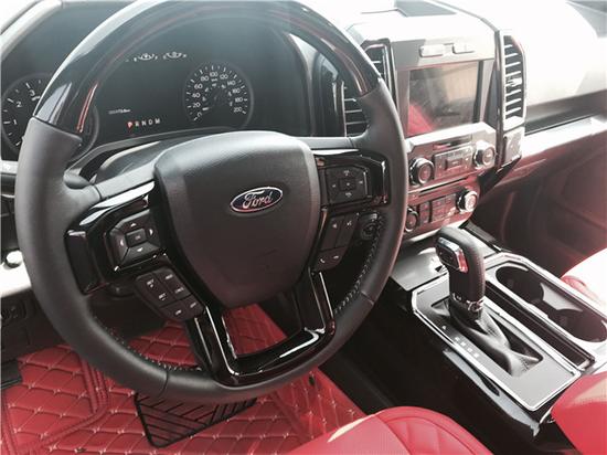 2017款福特F150车内一幅美国式的狂野和粗犷,车内方向盘够棒,可是就是有点太大,要是稍微小一点可能会更好。2017款福特F150的正副驾驶席中间布置了一个巨大的手枕,所有的按键、旋钮都集中在触手可及的位置,方便在驾驶时操作。