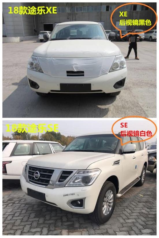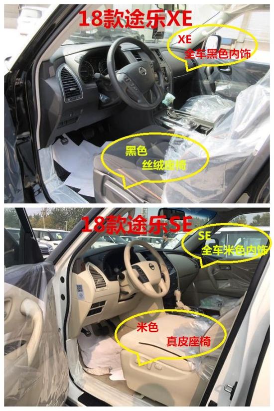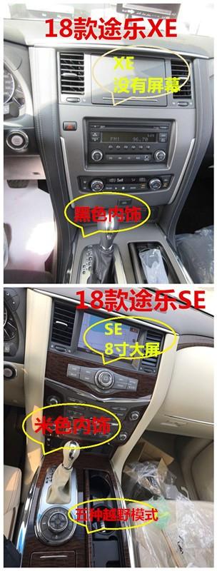 18款尼桑途乐XE: AT,7座,18轮,底挂备胎,两气囊,智能卡,无钥匙启动,手动调节丝绒座椅,智能四驱,多路况越野模式,后差速锁,上下坡辅助,多功能方向盘,定速巡航,冰箱,双区自动空调,后排风量调节,Led尾灯,胎压监测,中控台真皮包边+门板真皮包裹,电动折叠后视镜(黑色),脚踏,前后开启中央扶手箱,前后电眼。