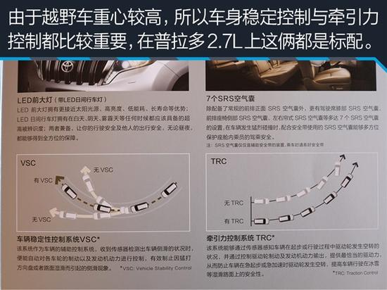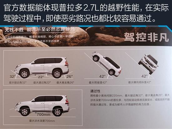 在越野数据上,普拉多 (配置|询价)2.7L最大涉水深度0.7米,最大爬坡度42度,接近角32度、通过角22度、离去角26度,对一款越野车而言,这样出色的数据保证了车辆的通过性。