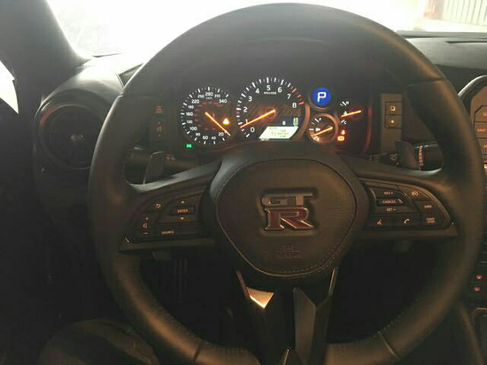 17款GTR内部这次也进行了升级,方向盘右侧的控制面板进行了重新布局,大屏上方增加了光盘插口,屏幕下方增加了出风口,保留了经典的飞机拨片,一键启动更改到档把前方原先在档把后方,这次不得不说的是方向盘样式也升级了,布局更加合理,并增加了镀铬。